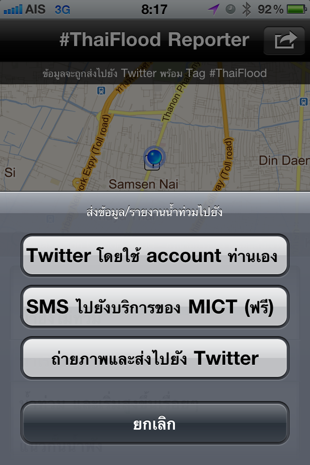 – สามารถรายงานข้อมูไปยีง twitter โดยมี tag #thaifloodไ้ด้ในตัว