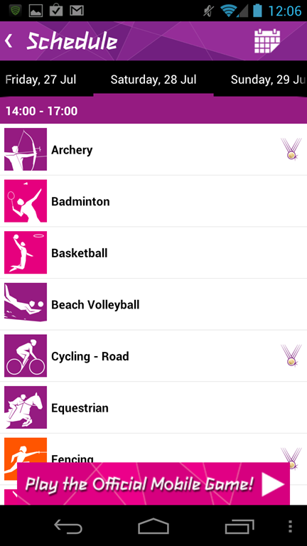 ในหัวข้อ Schedule จะแบ่งรายการแข่งขันกีฬาโอลิปิค 2012 ในแต่ละวัน
