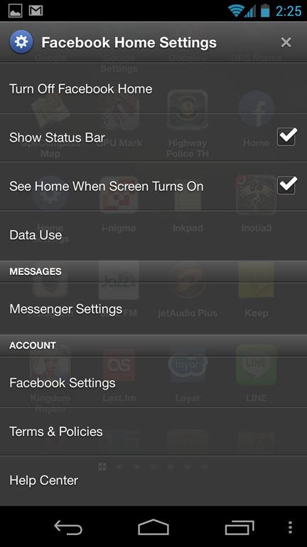– การปิด Turn Off Facebook Home สำหรับการปิด Launcher ตัว Facebook Home ในกรณีที่ต้องยกเลิกการใช้