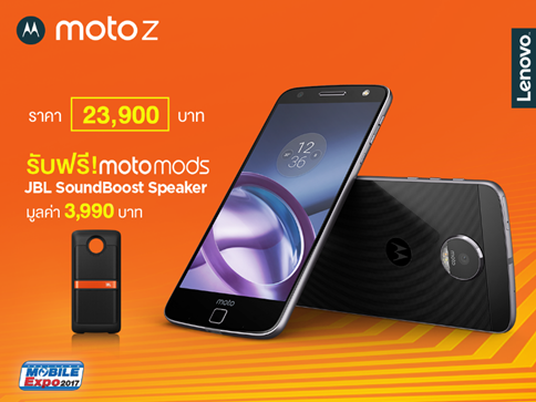 - ความพิเศษไม่หมดเพียงเท่านี้ เพื่อเป็นการเอาใจสาวกโมโต เราจึงมอบโปรโมชั่นสุดพิเศษให้กับลูกค้า เมื่อซื้อ สมาร์ทโฟนเรือธงระดับพรีเมี่ยมที่มาพร้อมนวัตกรรมเทคโนโลยีล้ำสมัย อย่าง Moto Z ราคา 23,900 บาท และ Moto Z Play ราคาเพียง 15,900 บาท รับฟรีทันที !! JBL Speaker อุปกรณ์เสริมเพิ่มพลังเสียงลำโพงให้กระหึ่ม ที่มีมูลค่ากว่า 3,990 บาท