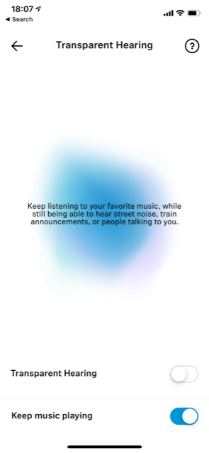 Transparent Hearing อันนี้ดูจะได้ใช้ประโยชน์อยู่บ้างเวลาที่ต้องการลดดเสียงรบกวน ซึ่งไม่ได้ถึงกับหายไปร้อยเปอร์เซ็นต์ ทดสอบง่ายๆ จะเสียงตอนที่ฟังตอนพิม์แป้นคียบอร์ดนี่ล่ะ คือค่า default จะกรองเสียงรบกวนอยู่แล้ว แต่ถ้าต้องการฟังเสียงภายนอกปิดไปซะนะครับ ไม่งั้นคุณจะตัดขาดจากโลกภายนอกไปเลยโดยสิ้นชิง ถ้าเสียบหูลงกล่อง แล้วมันจะตัดการเื่อมต่อทั้หมดนะครับ คือไม่สามารถตรวจสอบอะไรได้เลย ดูได้อย่างเดียวคือไฟสถานะ