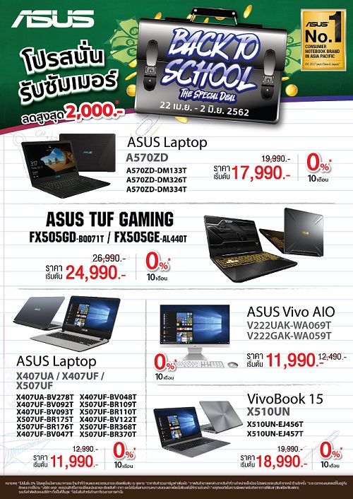 ASUS ส่งโปรโมชั่นเอาใจนักเรียน นักศึกษากับโปรโมชั่น ‘Back to School’ ผ่อน 0%* 10 เดือน พร้อมมอบส่วนลดสูงสุดถึง 2,000 บาท สำหรับโน้ตบุ๊กราคาประหยัดรุ่นยอดนิยมอย่าง ASUS Laptop A570ZD ที่แรงด้วยโปรเซสเซอร์ AMD Ryzen 5 , เกมมิ่งโน้ตบุ๊กรุ่นยอดนิยมที่ทั้งแรงและทนทานตามมาตรฐาน U.S. Military Standard อย่าง ASUS TUF Gaming FX505GD / FX505GE