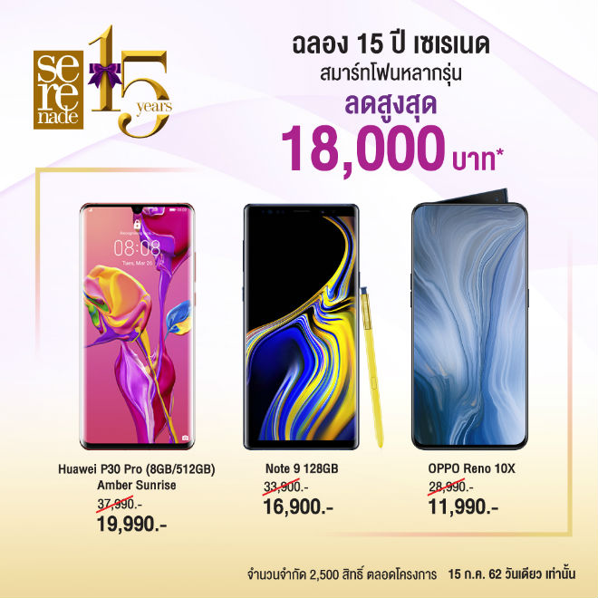 พร้อมกันนี้ ลูกค้าเซเรเนด ยังได้รับสิทธิ์เลือกซื้อสมาร์ทโฟนรุ่นท็อปในราคาพิเศษ ลดสูงสุด 18,000 บาท ไม่ว่าจะเป็น Huawei P30 Pro Amber Sunrise สีใหม่ (8GB / 512GB) จากราคาปกติ 37,990 บาท ลดเหลือเพียง 19,990 บาท และ Samsung Galaxy Note 9 จากราคาปกติ 33,900 บาท ลดเหลือเพียง 16,900 บาท และ OPPO Reno 10X จากราคาปกติ 28,990 บาท ลดเหลือเพียง 11,990 บาท จำกัดจำนวนเพียง 2,500 สิทธิ์ วันที่ 15 กรกฎาคมนี้ วันเดียวเท่านั้น ที่ AIS Shop และ Serenade Club สาขาที่ร่วมรายการ