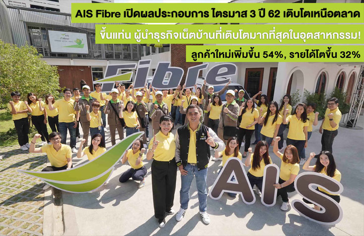 AIS Fibre เผยผลประกอบการไตรมาส 3 AIS Fibre มีรายได้เติบโตขึ้น 32% และมีอัตราการเติบโตของลูกค้าใหม่ เพิ่มขึ้น 54% หรือเพิ่มขึ้นจำนวน 81,600 ราย สูงที่สุดในรอบ 11 ไตรมาส ทำให้มีส่วนแบ่งการตลาดสูงขึ้นอย่างต่อเนื่องทุกไตรมาส