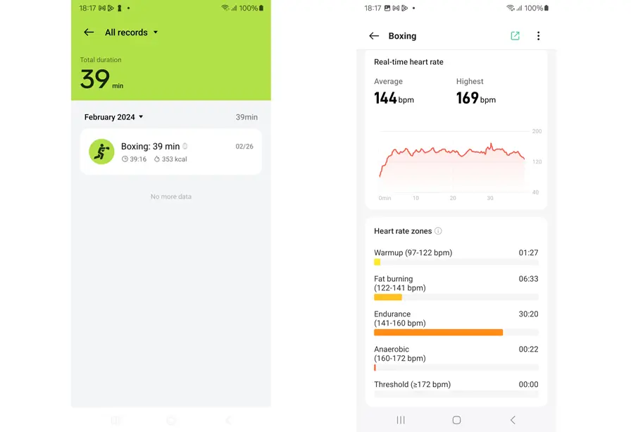 หนึ่งในการออกกำลังที่ผมทำประจำเวลาอยู่บนบกคือ “ชกมวย” ครับ แต่จะเป็นลักษณะ Shadow Boxing นี่ก็เลยเป็นสิ่งแรกที่ผมใช้ทดสอบกับตัวนาฬิกาและแอป การแสดงผลก็จะให้เห็นอัตราการเต้นของหัวใจ แสดงให้เห็น Heart Rate Zone ตามปกติมาตรฐาน แต่ถัดจากนี้เราจะลองลงลึกไปขั้นกว่า