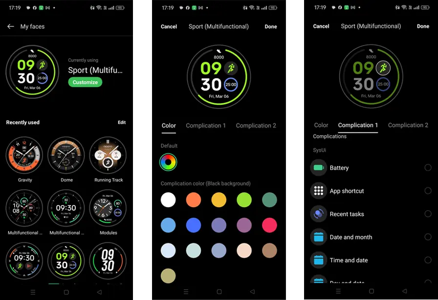 ในส่วนของ Watch Face นั้นยังสามารถปรับแต่งได้อีกนะครับ แม้ว่าจะเป็นอันที่มาพร้อมกับนาฬิกาเลยก็เถอะ โดยเราเข้าไปเลือกที่หัวข้อ Customize จากนั้นก็เลือก Color ถ้าต้องการเปลี่ยนสี หรือเปลี่ยนส่วนประกอบอื่นๆ ด้วยการเลือก Complication ครับ อย่าง Watch Face ตัวที่ผมเลือกใช้จะปรับแต่งได้สองจุด แต่ว่า Watch Face ตัวอื่นๆ ก็จะมีความสามารถแตกต่างกันไป รวมถึงรูปแบบการปรับแต่งที่แตกต่างกันขึ้นอยู่กับผู้พัฒนาด้วยครับ