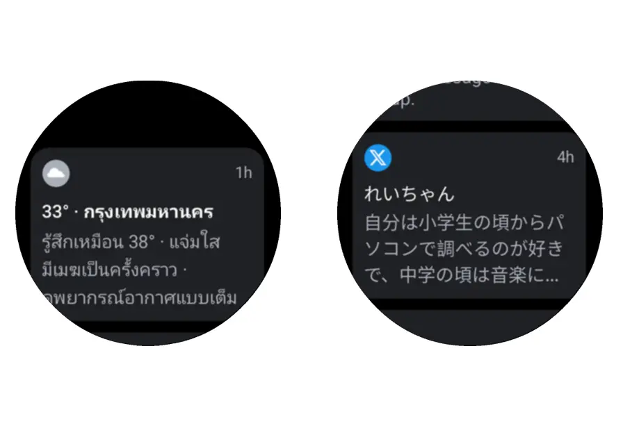 เรื่องของภาษา และการแจ้งเตือนน่าจะเป็นอย่างแรกๆ ที่จะถูกถามว่า แสดงผลภาษาไทยได้มั้ย อ่านรู้เรื่องหรือเปล่า การใช้ WearOS เลยมีข้อได้เปรียบตรงนี้ครับ คือภาษาไทยอ่านออกได้แบบครบถ้วนสมบูรณ์ คืออย่าว่าแต่ภาษาไทยเลยภาษาอื่นในหน้าแจ้งเตือนก็อ่านออกครับ อย่างผมตาม Twitter ที่เป็นผู้ใช้จากญี่ปุ่นเยอะ ตัวผมเองก็โพสต์ภาษาญี่ปุ่นลง Twitter ด้วย ดังนั้นการแจงเตือนผมก็แสดงผลภาษาญี่ปุ่นได้ครบถ้วน .. สบายใจไปได้แล้วหนึ่งเรื่อ