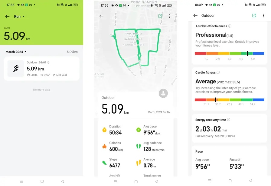 อันนี้เป็นผลการเก็บค่าจากสถิติ และมาตรวัดหลังจากการวิ่ง สิ่งที่เราเองก็พอใจพอสมควรคือตัวนาฬิกาและแอปพลิเคชั่นให้ข้อมูลที่ละเอียด เข้าใจง่ายสำหรับนักวิ่งระดับเริ่มต้น และระดับกลาง