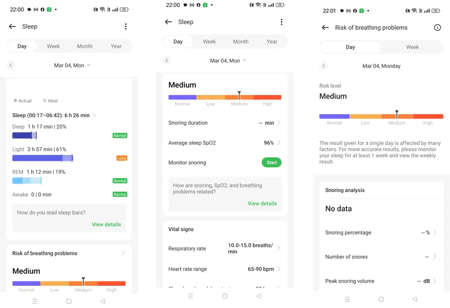 การตรวจจับพฤติกรรมการนอนนั้นก็เป็นนเรื่องสำคัฯครับ เพราะหลังจากออกกำลังราางกายเราก้ต้องการการซ่อมแซมและฟื้นฟู โดนก็จะแบ้่งคุณภาพการหลับของเราเป็นสามระดับ คือ Deep ,Light และ Rem แล้วนำมาประมวลผลว่าเรามีตุณภาพการนอนเป้นอย่างไรบ้าง สิ่งที่น่าสนใจคือ “Risk of breathing problems” นั่นก็คือเรื่องของความเสี่ยงในการหายใจระหว่างการนอนหลับซึ่งในแอปก็จะวัดได้ใน 4 ระดับซึ่งค่าตรงนี้จะเปลี่ยนไปในแต่ละวันขึ้นอยู่กับสภาวะร่างกาย ความเครียด การพักผ่อนสะสมด้วยนะครับ และนอบจากนั้นยังวัดระดับการกรนได้โดยใช้ร่วมกับสมาร์ทโฟนครับ