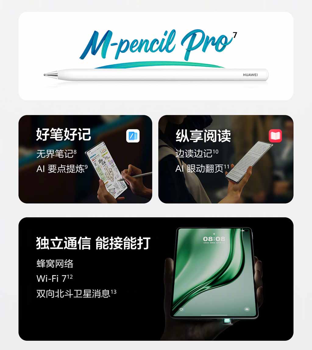 - การเชื่อมต่อ: รองรับเทคโนโลยี 5G และ Wi-Fi 7 ช่วยเพิ่มความเร็วในการดาวน์โหลดขึ้น 94% นอกจากนี้ยังเป็นแท็บเล็ตรุ่นแรกที่รองรับการสื่อสารแบบ Lingxi ซึ่งช่วยปรับปรุงการเชื่อมต่อสัญญาณเซลลูลาร์ได้ดีขึ้น 72% ทั้งในแนวตั้งและแนวนอน