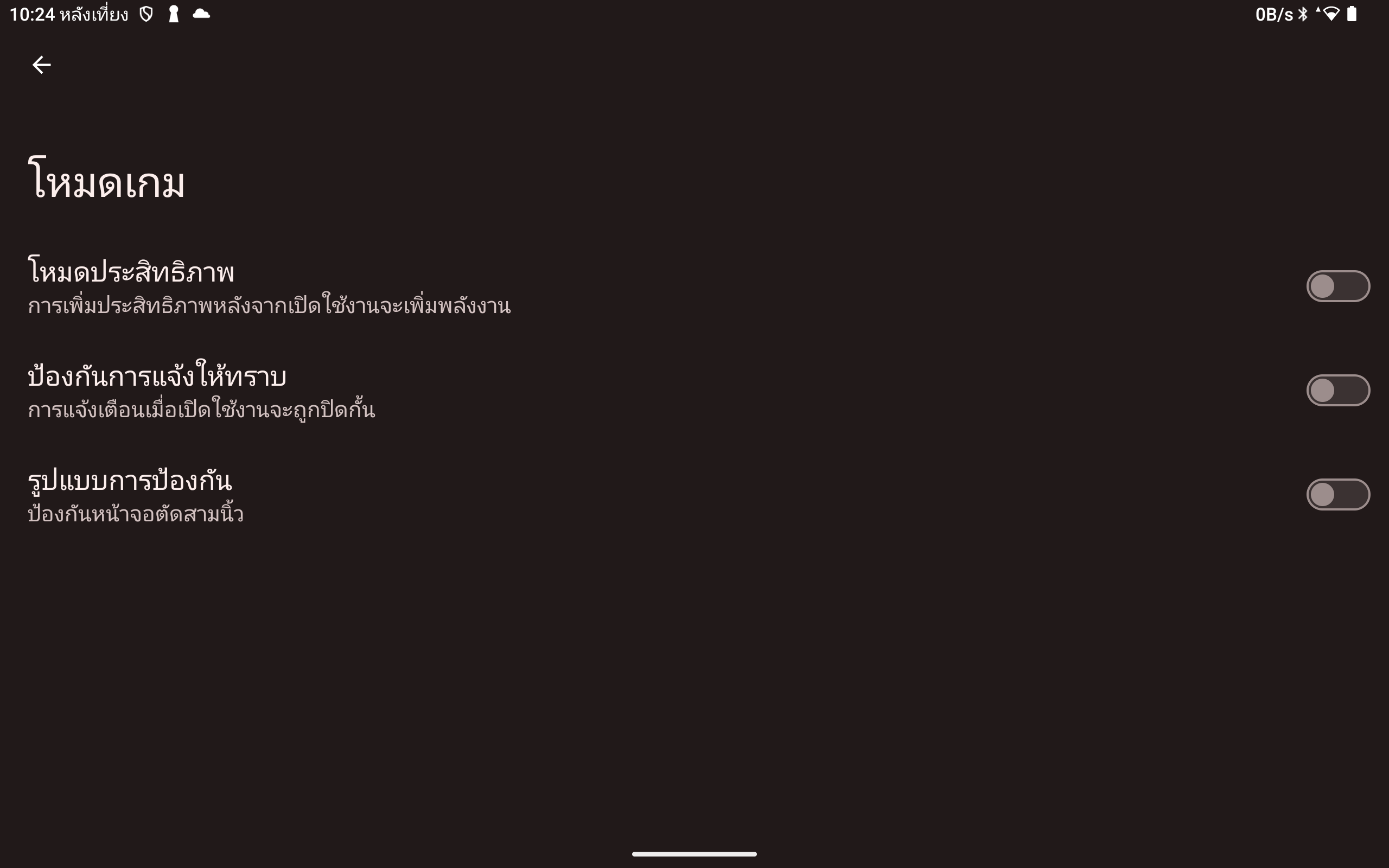 อย่างแรกคือ ให้มาที่ “โหมดเกม” ก่อนครับ แล้วเปิดที่ “โหมดเพิ่มประสิทธิภาพ” ซึ่งตรงนี้จะไปสั่งให้หน่วยประมวลผลทำการคำนวณให้เร็วมากขึ้น แต่แบตเตอรี่ก็จะลดลงเร็วเช่นกัน แต่แบตเตอรี่ 7000 mAh ก็เปิดไปเถอะ ส่วนหัวข้อ “ป้องกันการแจ้งให้ทราบ” อันนี้ปิดไปก็ได้ครับ เพื่อไม่ให้มรการทำงานในฉากหลังซึ่งแอปจะมีการ refresh ตัวเองเป็นระยะทำให้มีการใช้อินเตอร์เน็ต และการแจ้งเตือนก็มักจะบังหน้าจอด้วย แม้จะช่วงสั้นๆ ก็เถอะ