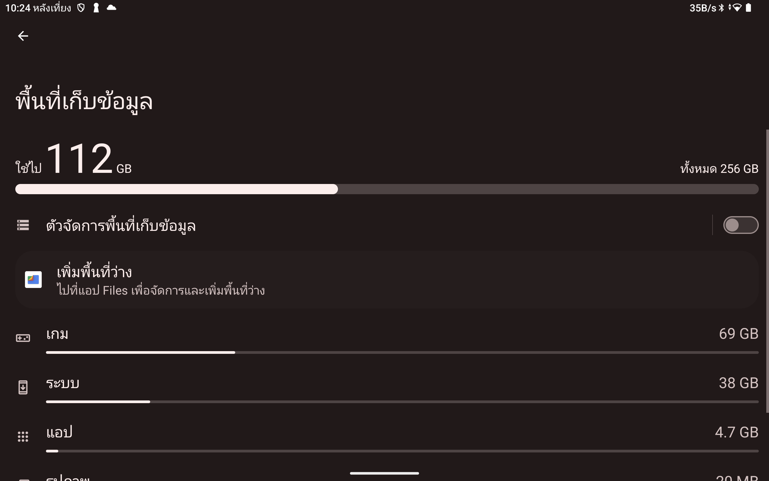 ในตัวครื่องรุ่นนี้ให้พื้นที่หน่วยความจำมา 256 GB คือก็พอสำหรับเกมใหญๆ อยู่ แล้วถ้าพื้นที่เก็บข้อมูลยังเหลือ เราเอามาทำเป็นพื้นที่ Virtual Ram ได้อีก โดยเข้าไปที่ที่หัวข้อ เกี่ยวกับอุปกรณ์ แล้วตรงหัวข้อ หน่วยความจำครับ จะปาดลากเท่าไหร่อันนี้แล้วแต่เลือก